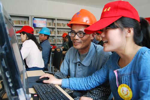 4月14日,江苏科技大学的学生在指导农民工学习网上购买火车票的方法。当日,江苏省镇江市农民工网络学堂在润州区七里甸街道万科社区成立,来自江苏科技大学数理学院的大学生志愿者将定期走进学堂,为当地的外来务工人员传授网上购票、网上购物、网上读书等知识和技能。新华社发(石玉成 摄)